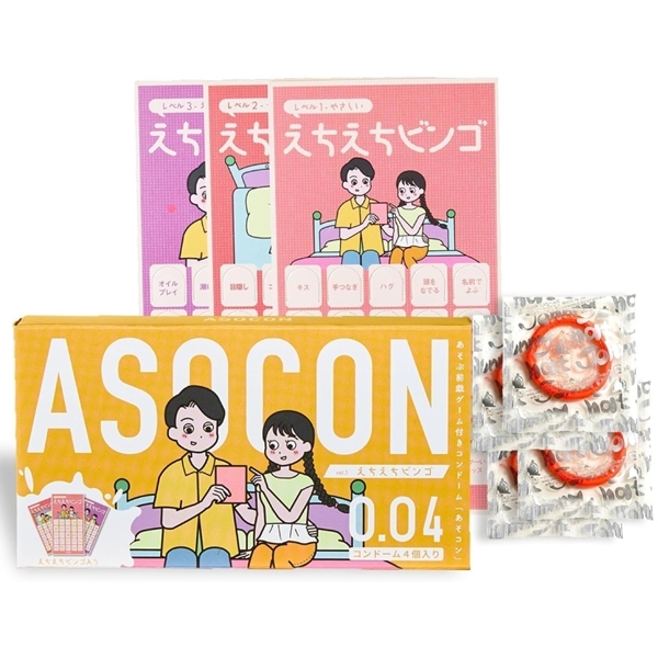 遊び心たっぷりの新感覚アイテムが登場♪あそぶ前戯ゲーム付きコンドーム「ASOCON」えちえちビンゴカードは、ビンゴ形式で楽しく盛り上がれるカード付きセットです!3種類のビンゴカードには、お題がそれぞれ異なるマスが並んでいます♪順番にお題をこなしながらビンゴを目指せば、自然と会話も弾みます!ルールはシンプルでカードのマスに書かれた内容にチャレンジし、縦・横・斜めでそろえばビンゴ成立です♪ゲーム性が高く、マンネリしがちな夜もわくわくする時間に早変わり!セットには、0.04mmのコンドームが4個付属しています♪天然ゴムラテックス製でゼリー加工済み!サイズや仕様にもこだわり、使いやすさも兼ね備えた設計です♪気軽に楽しめるコンパクトなパッケージなので、ちょっとしたプレゼントにもぴったりです!